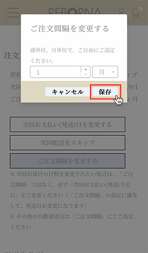 定期注文の周期は、初回のご注文後はいつでも、マイページから、週単位、月単位で、ご自由にご設定いただけます。