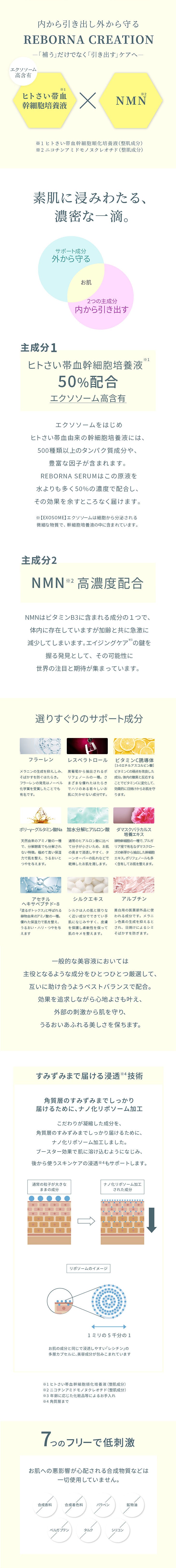 - 洗顔後のきれいなお肌に、最初に導入型美容液のREBORNA SERUMを使用し、その後に、化粧水・クリームをお使いいただくことをおすすめしております。詳しくはホームページの「How to REBORNA」をご覧ください。